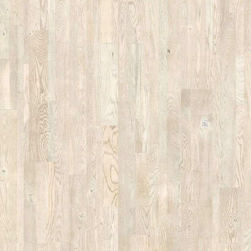 The wood of the “Variano Painted White Oak” was first finished with white, after which the surface was given a gentle sanding. Doing so, the higher pieces were slightly toned down, giving them that ‘worn underfoot’ look. Some of the cross-joints, which hold the most white, were given an extra bout of sanding. The result is a unique combination of texture and colour shades.